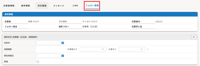 フォロー情報では、フォロー担当者や内定・入社予定の管理などが可能です。