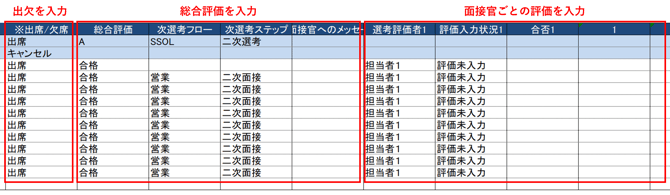 ・イベント参加者一覧ファイル上では上限10人までの評価入力者・合否・評価入力状況・評価項目列(1~10)を入力できます。