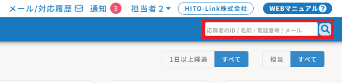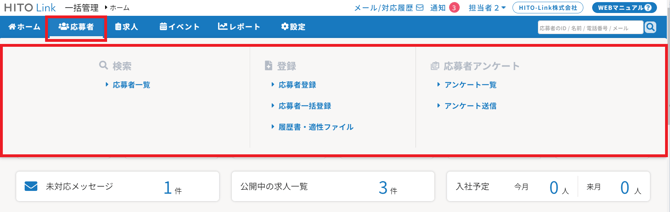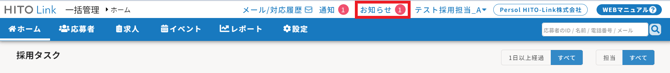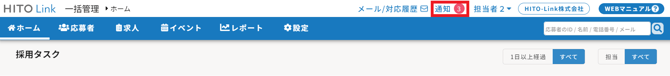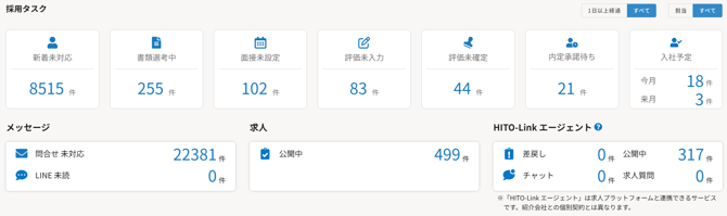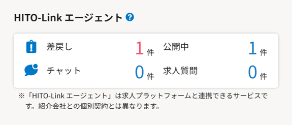 | チャット | HITO-Linkエージェント経由の応募者に関して、エージェントから来た未読のチャットや通知の件数が表示されます。 参考:応募者とチャットのリンクはる |