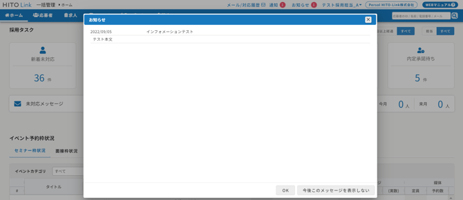 採用担当/面接担当マイページにログインした後に、ポップアップでお知らせ掲載することもできます。システムからのお知らせもこちらに掲載されます。