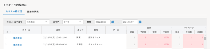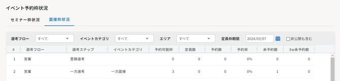 ※イベントカテゴリで「定員管理」にチェックが入っているイベントが「セミナー枠状況」に表示され、評価入力が必要な面接等は「面接枠状況」に表示されます。