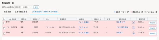 評価未入力のシステム内全ての面接が表示されます ※フロー限定担当の場合は評価未入力かつ自身が担当する選考フローの面接が表示されます |