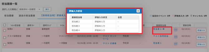 「面接担当者」をクリックすると、各面接担当の入力状況と合否が一覧でわかるポップアップが表示されます。