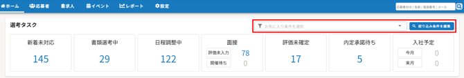 • 選考タスク上で、絞り込みが可能です。また、直近で使用した絞り込みが自動反映されるため、都度絞り込みを行う必要もありません。