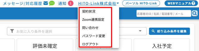 ログインアカウント名にカーソルを合わせると「契約状況」「Zoom連携設定」「問い合わせ」「パスワード変更」「ログアウト」が表示されます。