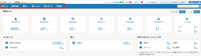 HITO-Link のメインメニューは画面上部にカテゴリごとに表示されます。