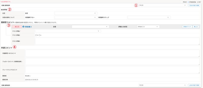 面接担当権限の場合、②の設定が有効の場合のみ共通コメント(次面接官へのコメント欄)が表示されます。