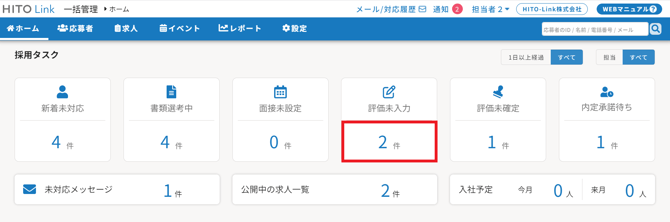 1.マイページの採用タスクで「評価未入力」の数字をクリックし