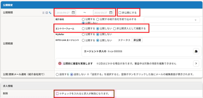 公開期間を入力します。求人自体を非公開にしたい場合は「非公開にする」にチェックをいれます。