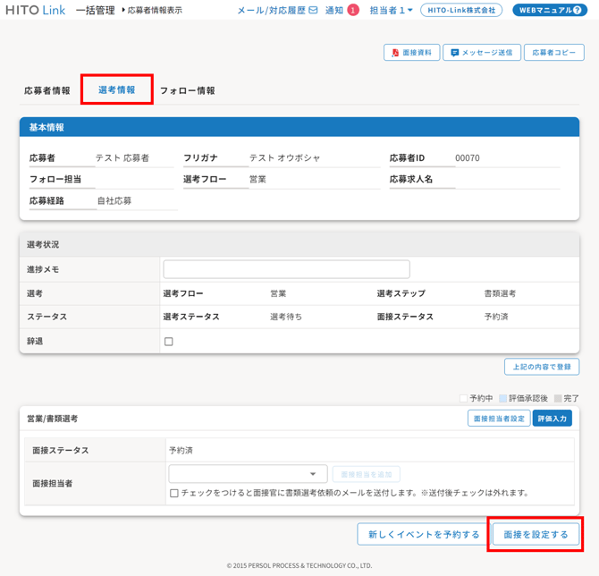 ②応募者情報画面の〔選考情報〕タブ内下の〔面接を設定する〕をクリックし、必要事項を入力して〔面接設定完了〕をクリックします 。