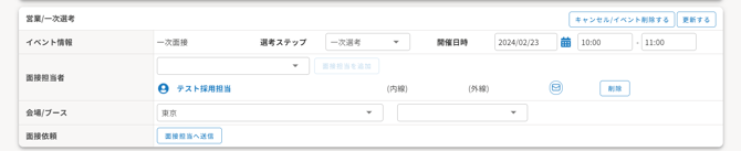 ③面接設定が完了すると、応募者画面に設定したイベントが反映されます。キャンセルしたい場合は〔キャンセル/イベント削除する〕をクリックするとキャンセルできます。