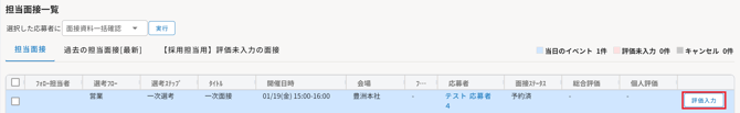②予約済の面接の「評価入力」をクリックすると評価入力ができます。