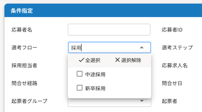 ※複数選択可能なプルダウン(選考フロー、選考ステップ、採用担当者)は検索が可能です。単一選択のプルダウンはテキスト検索の対象外です。