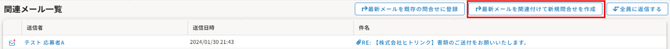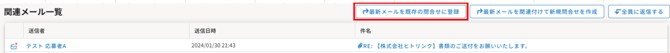 新着メールを紐づけた状態で新規問合せを作成したい場合は、対応履歴IDをクリックして問合せ登録画面を開き、関連メール一覧右上の〔最新メールを関連付けて新規問合せを作成〕をクリックすると問合せ履歴を登録できます。