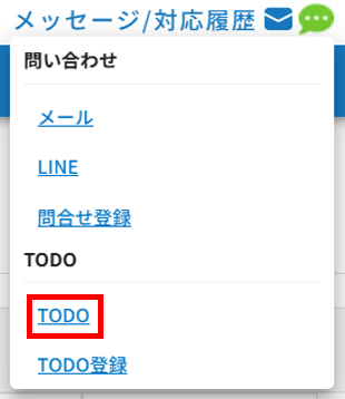 登録したTODOは、〔メッセージ/対応履歴〕 > 〔TODO〕で確認できます。