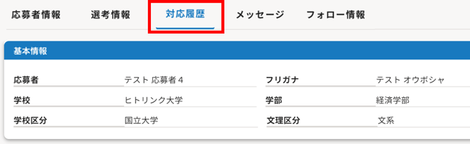 - 応募者に紐づけて問合せ登録をすると応募者情報画面に「対応履歴」が追加されます