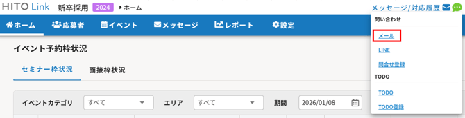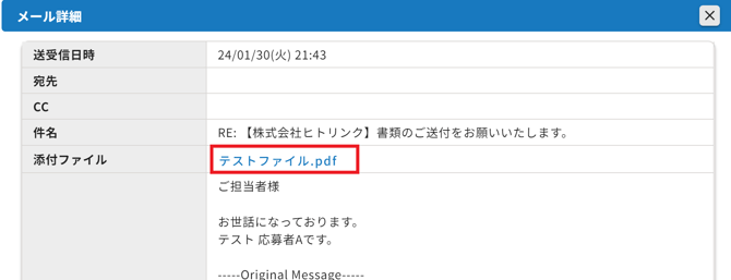 応募者詳細画面を開き「メッセージ」タブでも受信メールを確認・返信ができます。
