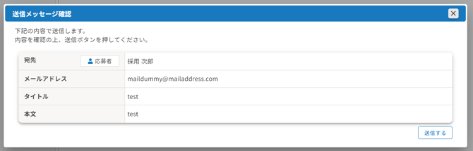 3.〔メール送信〕をクリックすると確認画面が開くので、内容を確認して〔送信する〕をクリックします。送信したメールは、応募者の「メール送受信履歴」タブで確認できます。
