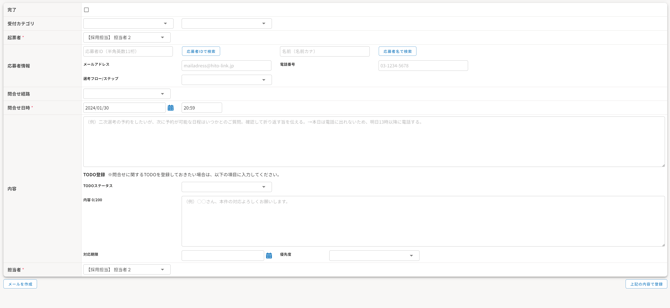 ・応募者情報画面を開いた状態で〔問合せ登録〕をクリックすると、応募者情報が自動反映されます。