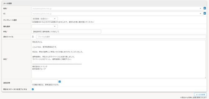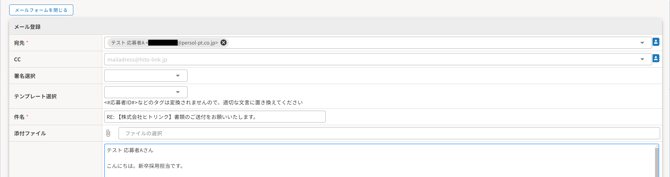 登録済みのメッセージテンプレートを選択できます。 ※問合せ登録のメール作成画面では<#応募者ID#>などのタグは置換されませんのでご注意ください |