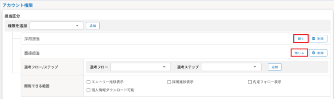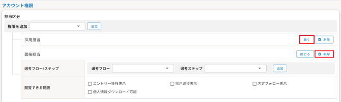 プルダウンを開いて、担当区分を選択し、「追加」を押下してください。 - 各権限で詳細の設定をすることが可能です。