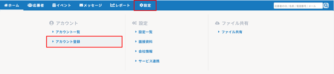 採用担当、採用担当(フロー限定)、面接官、受付担当のアカウントを登録できます。