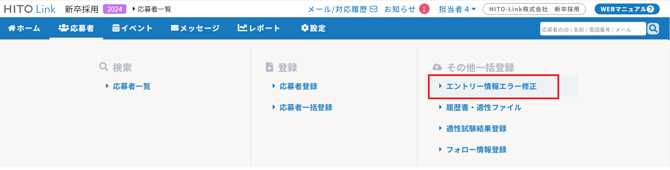 メインメニュー>応募者>エントリー情報エラー修正 をクリックします。