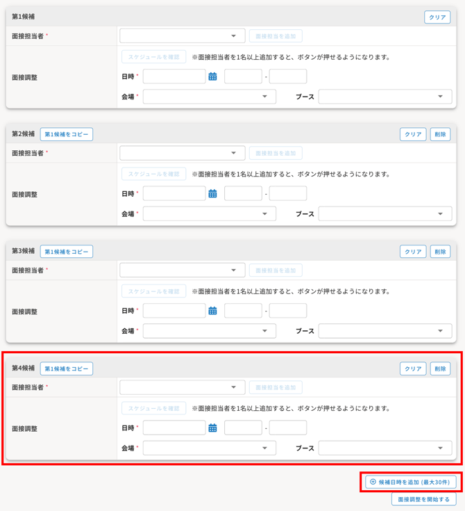 4.面接の候補日を入力します。第1候補を入力したら第2候補以降はコピーして入力もできます。〔候補日時を追加(最大30件)〕をクリックすると第3候補以降の日時枠が1つ追加されます。追加したい日時数に合わせて〔候補日時を追加(最大30件)〕を押下してください。最大第30候補まで追加が可能です。