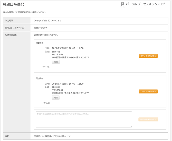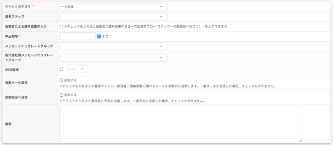 | 備考 | 応募者にて選択いただく日程選択画面に表示する備考項目を入力してください |