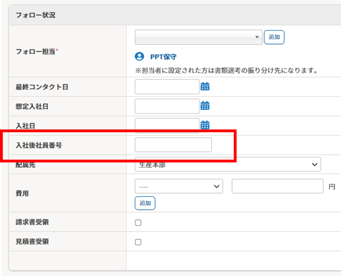 これまで候補者情報>アカウント管理に入力項目があった「入社後社員番号」ですが、リニューアル後は、フォロー備考>フォロー状況内に変更となります。