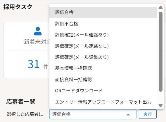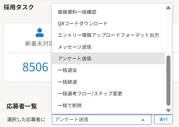 ※今回リリースされるのは、ホーム>採用タスク>各採用タスクの件数 をクリックすると表示される、下記の応募者一覧の「選択した応募者に」のプルダウン箇所です