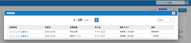 選考終了した応募者(辞退者/不合格者/入社者)を検索した場合の検索結果では、各応募者の 「選考フロー」「選考ステップ」、「選考ステータス」は表示されませんでした。