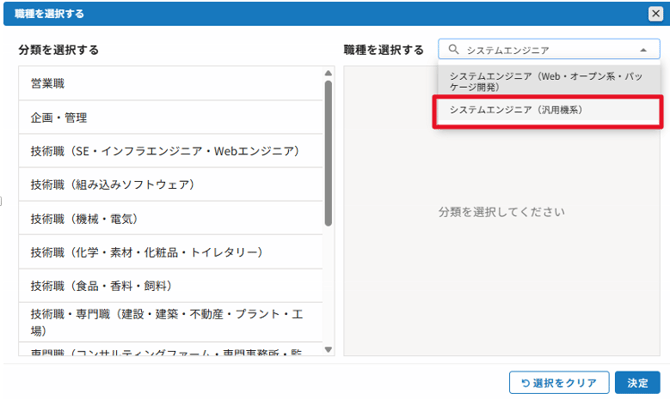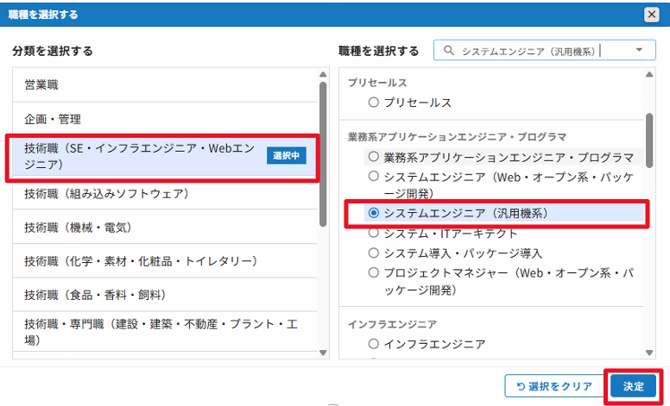例)システムエンジニア(汎用機系)を選択する場合