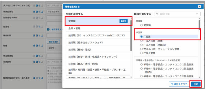 分類を選択する>営業職選択>右側の職種内で該当のIT営業を選択>〔決定〕