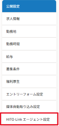 求人>求人登録画面の左サイドメニューに〔HITO-Linkエージェント設定〕が表示されます。
