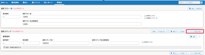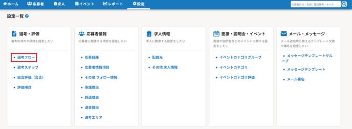 設定>設定一覧>選考フローを選択すると、関連する各種項目を一画面にて確認できます。
