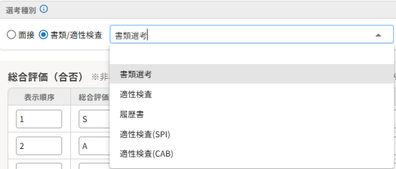 総合評価 | 評価入力時、合否欄に表示する名称を入力します。 例:合格/不合格/再面接、A/B/不合格 等 ![]() ※半角カッコを使用すると正しく検索できなくなる場合があるため使用しないでください ※選考結果区分((合格)(不合格)等)はプルダウンに自動で表示されますので、総合評価に登録する必要はありません |