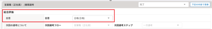選考結果区分 | 合格/不合格/再面接のいずれかを選択します。 ※再面接はその選考ステップで、再度選考を行う場合がある際に設定 |