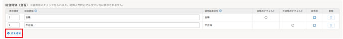 表示順序 | 評価入力時、合否欄でプルダウン上に表示する順序です。 |