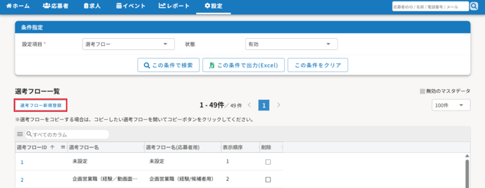 2.選考フロー一覧から〔選考フロー新規登録〕をクリックします。