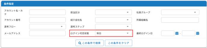 4.ログイン不可にしたアカウントは、アカウント一覧>条件指定にて、ログイン可否状態「無効」を選択すると確認可能です。