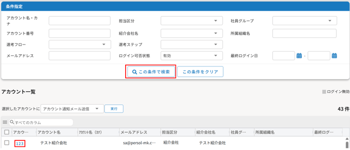 2.アカウント一覧で条件を指定して検索し、該当のアカウント番号をクリックします。