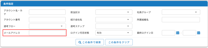 - メールアドレス検索の検索対象は「メールアドレス項目」のみとなります。