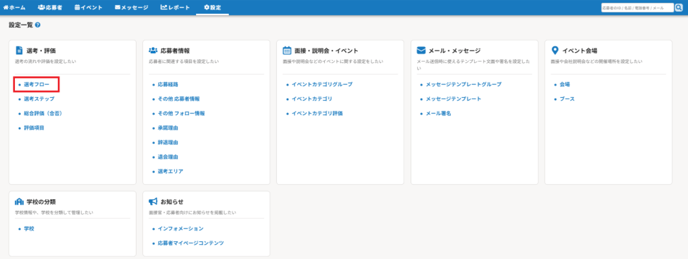 設定>設定一覧>選考フローを選択すると、関連する各種項目を一画面にて確認できます。