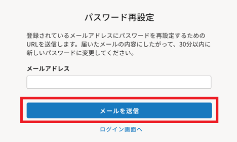 4.パスワード再設定画面でアカウントとして登録されているメールアドレスを入力し、〔メールを送信〕をクリックします