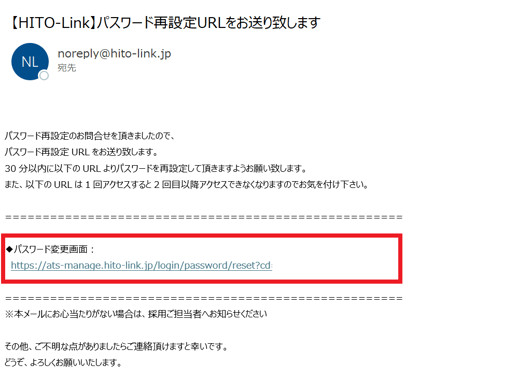 5.入力したメールアドレス宛にメールが届きます。メール内のパスワード再設定画面URLをクリックします。