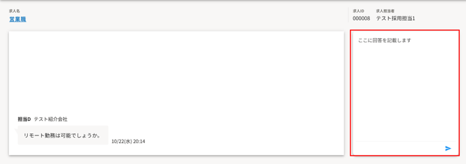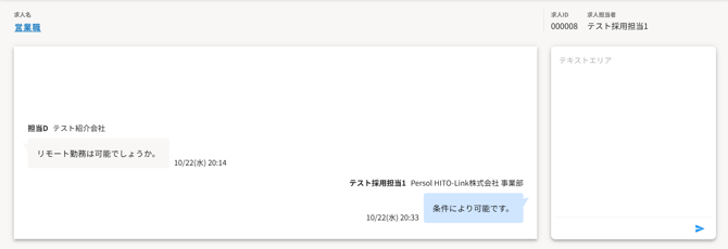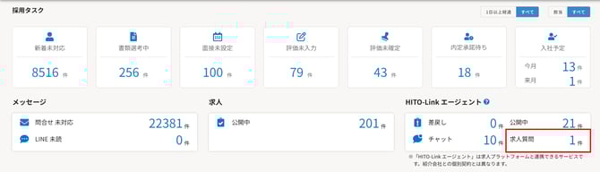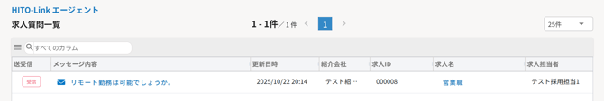 エージェントからの推薦前の求人質問に回答する ≡ 目次 💡 求人質問とは 求人質問に回答する 💡 求人質問とは HITO-Linkエージェントに求人を公開した後、紹介会社から推薦前に求人に関して質問が届くことがあります。早めに回答して推薦を促しましょう! 求人質問に回答する 求人質問が届いた場合には、求人の担当者に通知が届きます。また、ダッシュボードでも確認が可能です。 1.求人質問一覧をひらきます。 2.「メッセージ内容」をクリックしメッセージ画面をひらきます。テキストエリアに回答を入力して送信してください。 エージェントからさらに返信が来た際は再度通知から開いてご対応ください。 🔎 ヒント 質問のやり取りは 求人✖紹介会社 単位で表示されます。