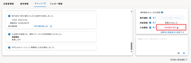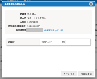 早期退職が発生した場合の対応手順 ≡ 目次 💡 早期退職が発生したら 早期退職の報告をする 💡 早期退職が発生したら 早期退職が発生した場合は、早期退職の返金規定に伴って返金いたします。返金のためには、HITO-Linkにて報告を行っていただく必要があります。 早期退職の報告をする 1.候補者詳細>チャット より〔早期退職を報告〕をクリックしてください。 2.退職日を入力して〔内容の確認〕後、〔早期退職報告をする〕で報告してください。 報告後、紹介会社よりチャットなどで質問が来た場合はご対応をお願いします。 紹介会社より返金があり次第、弊社より採用企業様宛に入金させていただきます。
