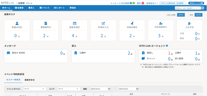 HITO-Linkエージェントに関する必要タスクも確認することができるので、差し戻された求人の対応や、エージェントとのチャット対応などで対応必要なものがどのくらいあるのか、わかりやすくなっています。