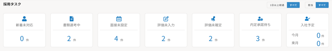 ステータスごとに応募者が何名いるかを確認でき、数字をクリックすると対象応募者が一覧で確認できます。ステータスごとに分かれているため、何をしなければいけないかを一目で判断できます。